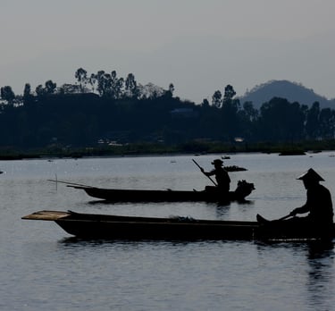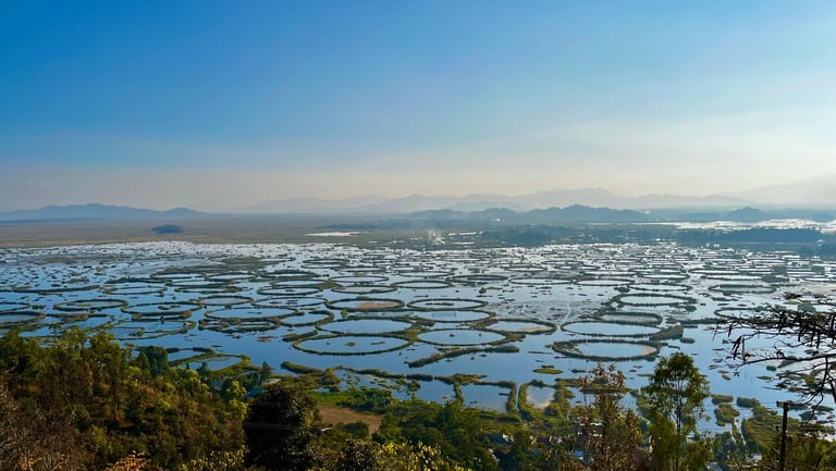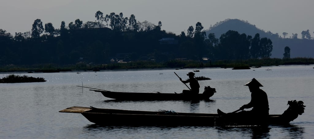 Image: Fisherman with their boats across the tranquil waters of Loktak Lake